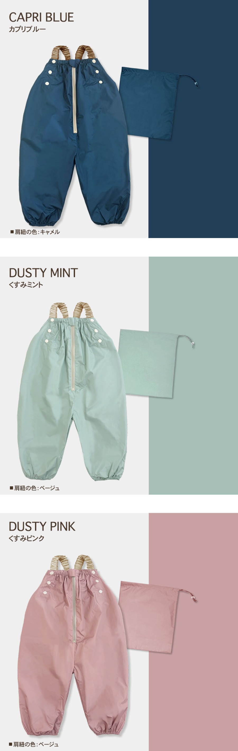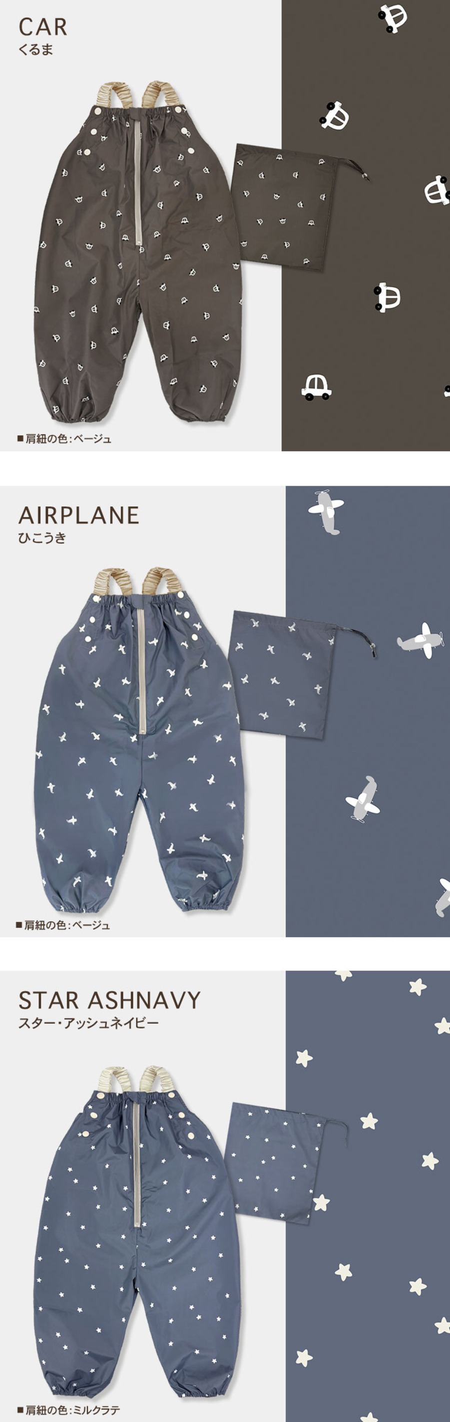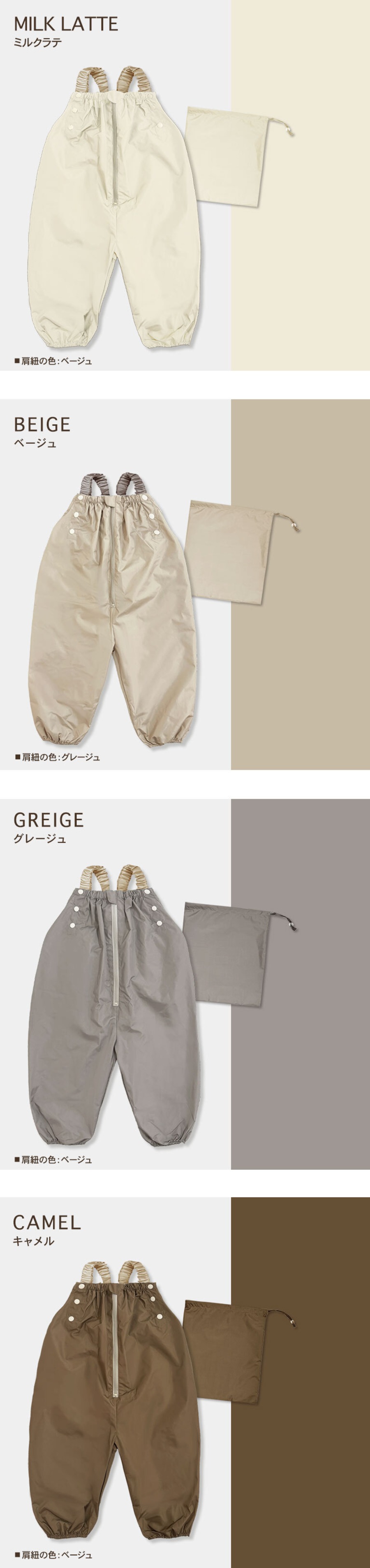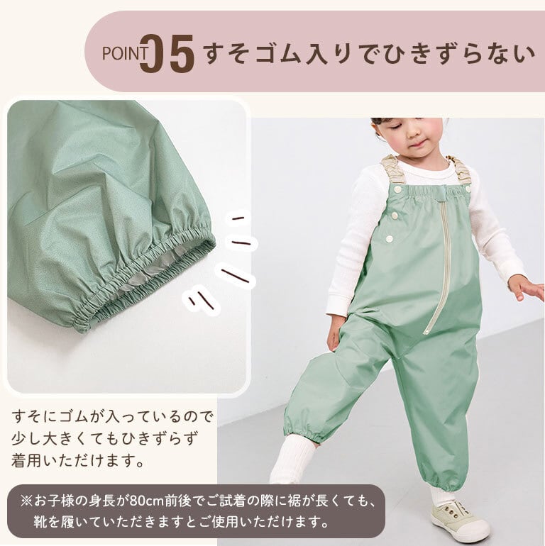 ●水を弾きやすく、汚れも付きにくい安心の防水・撥水加工生地を使用。雨の日はレインパンツとしてもお使いいただけます。