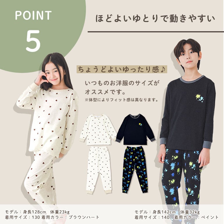 ●袖口・足首はリブ仕様なので、寝ていてもめくれあがりにくく、大きめサイズを買ってもだぼつかず着用できます。