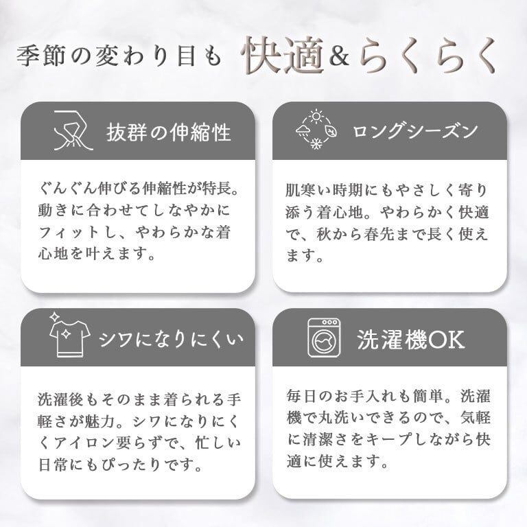 しっとりなめらかな肌触りの、あったか起毛リブ素材。