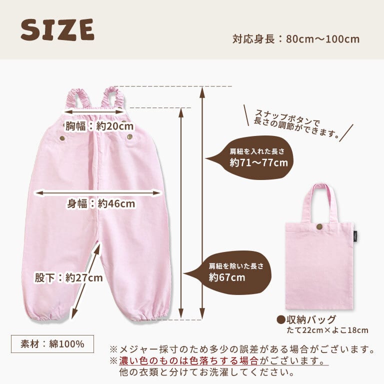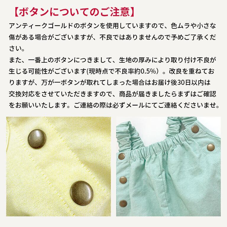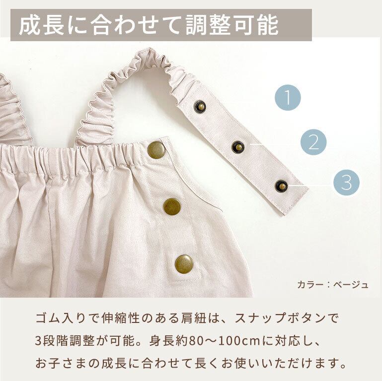 スナップボタンで肩紐調節可能だから、お子様の成長に合わせて長くお使いいただけます。