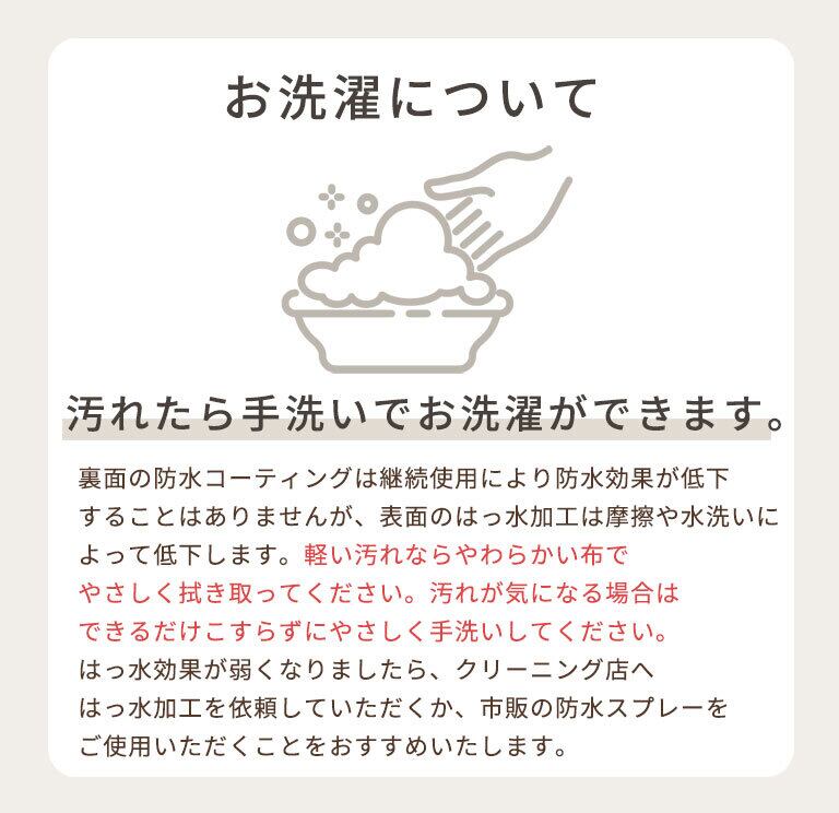 裏面の防水コーティングは継続使用により防水効果が低下することはありませんが、表面はっ水加工は摩擦や水洗いによって効果が低下しますので、できるだけこすらずにやさしく洗ってください。