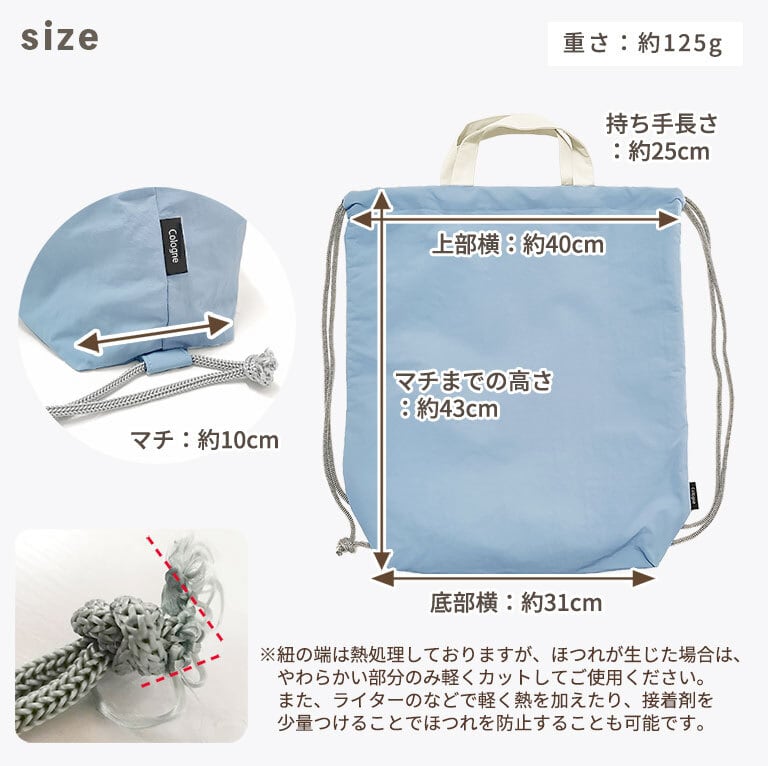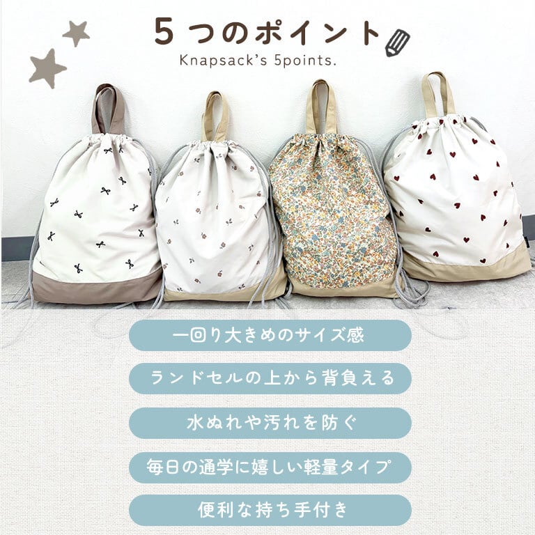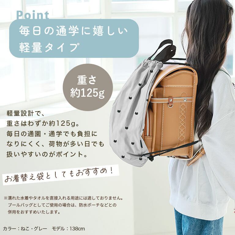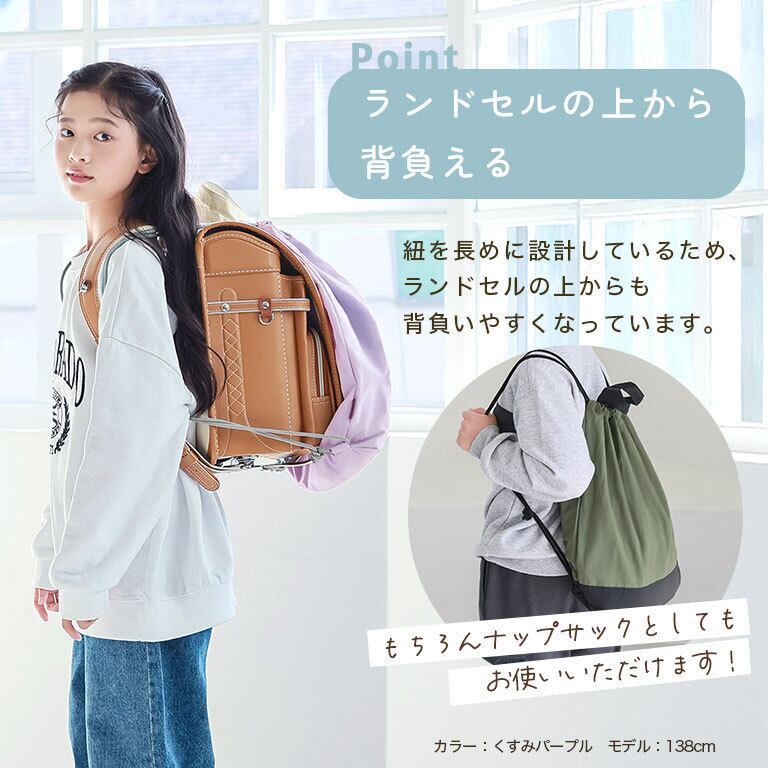 ●紐を長めにしてあるので、ランドセルの上からも背負いやすい♪もちろん、普通にナップサックとしてもお使いいただけます。