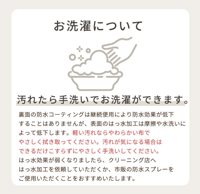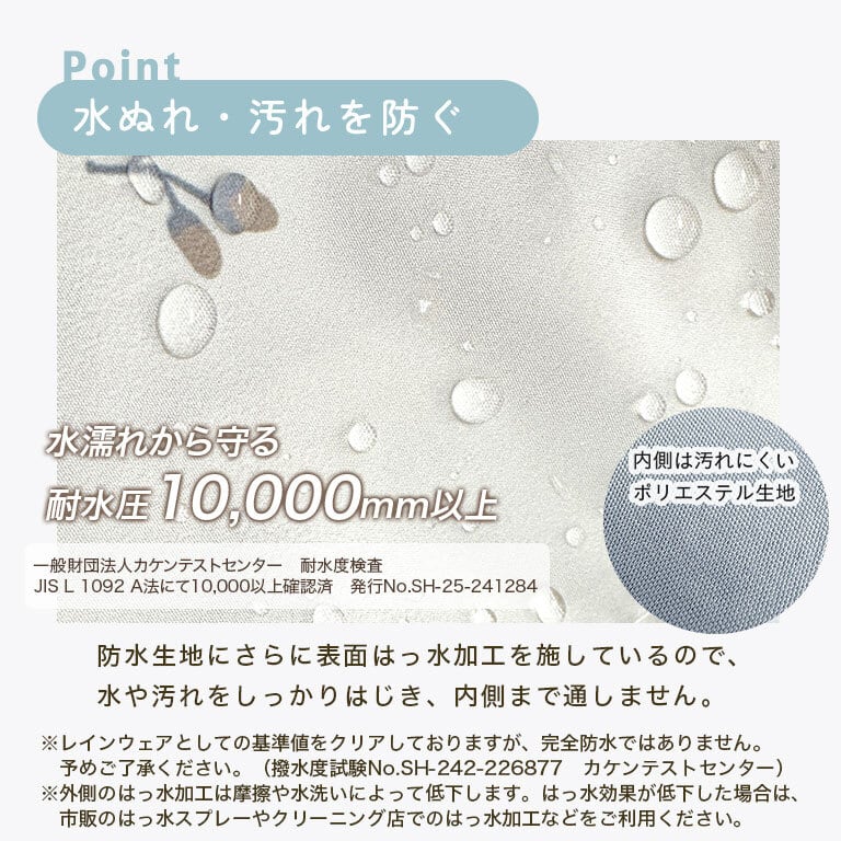 表地:ポリエステル100%(伸縮性なし)(防水コーティング・撥水加工あり)