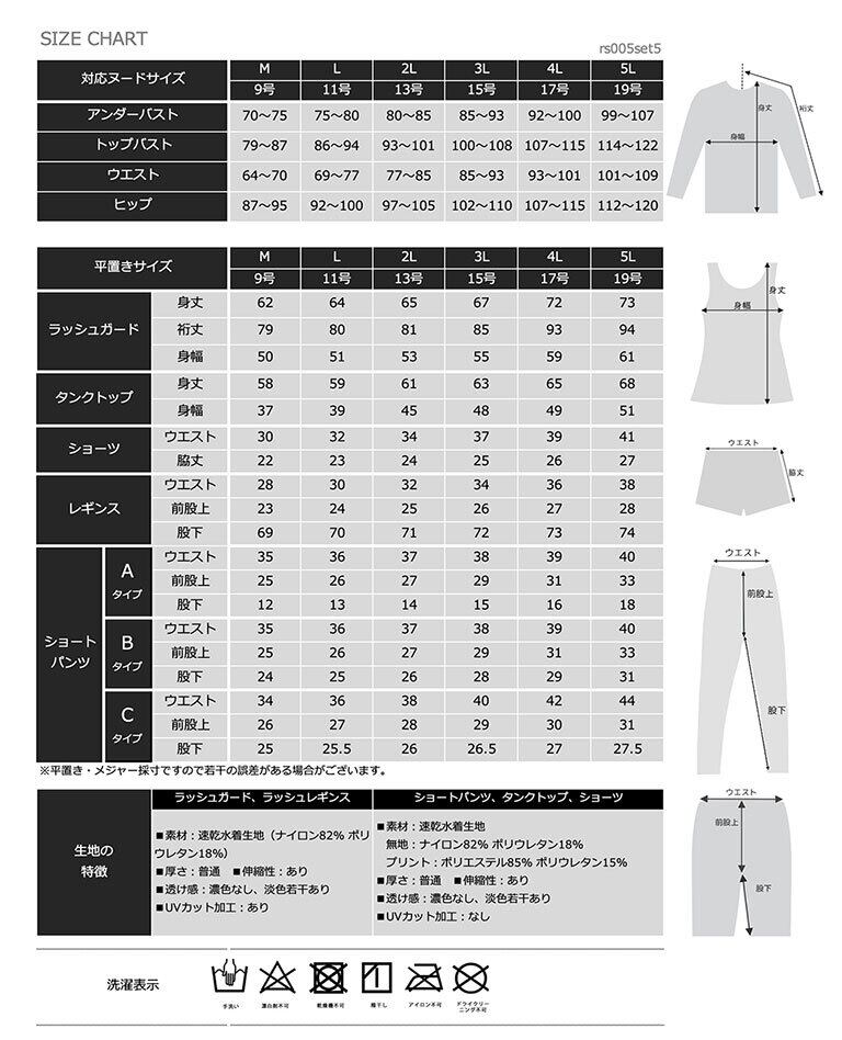 UVカットラッシュガード・ショートパンツ・上下タンクトップ水着・ラッシュレギンスのお得な5点セット