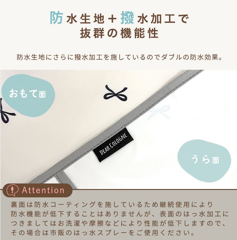 ※裏面の防水コーティングは継続使用により防水機能が低下することはありませんが、表面のはっ水性能は摩擦やお洗濯により低下します。