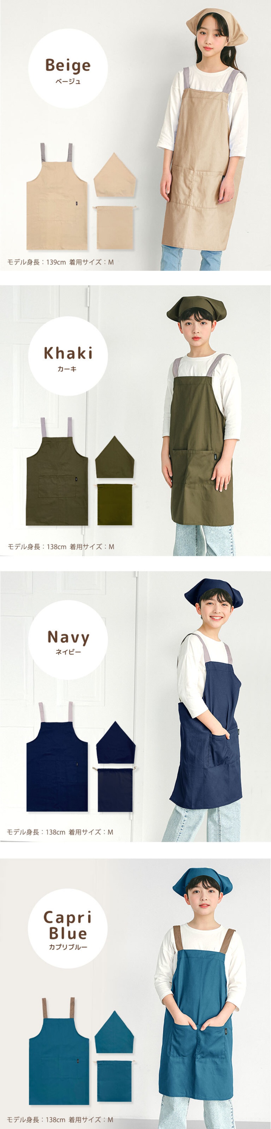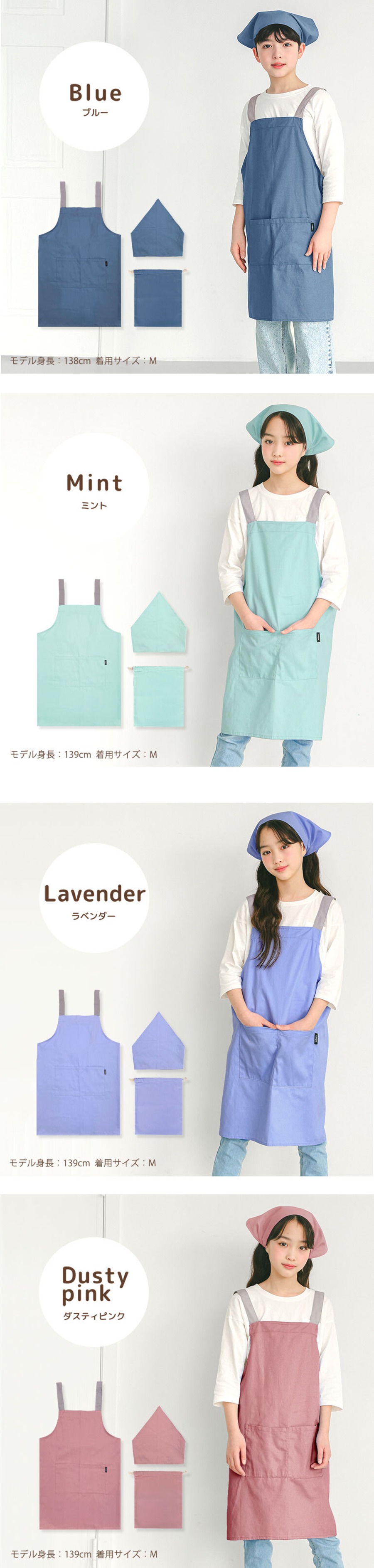 ●エプロン、三角巾、巾着袋の3点がセットになっているからすぐ使えて便利!