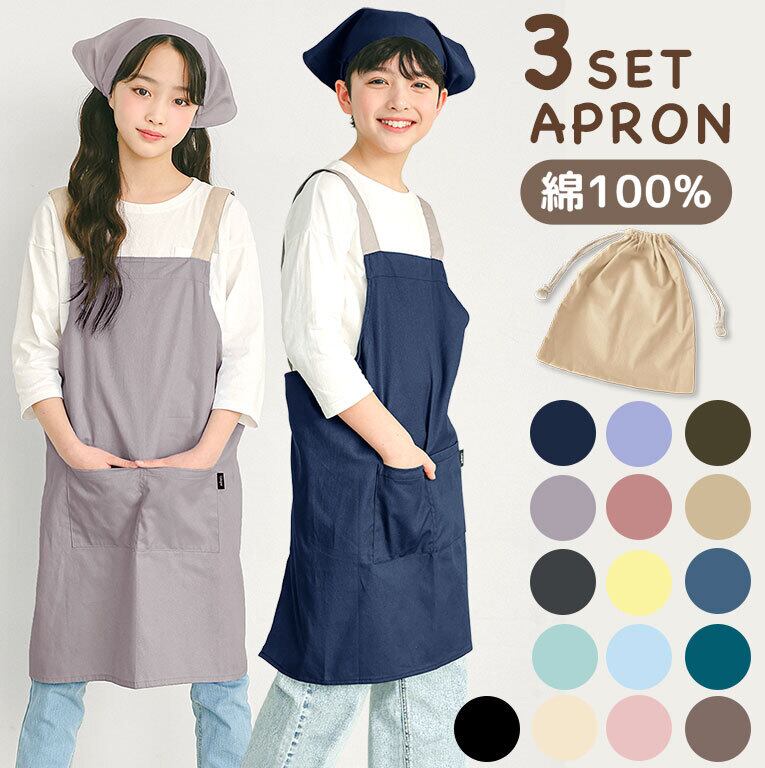 【メール便】エプロン キッズ 三角巾 3点セット こども おしゃれ かわいい 綿100% 収納袋付き dk082