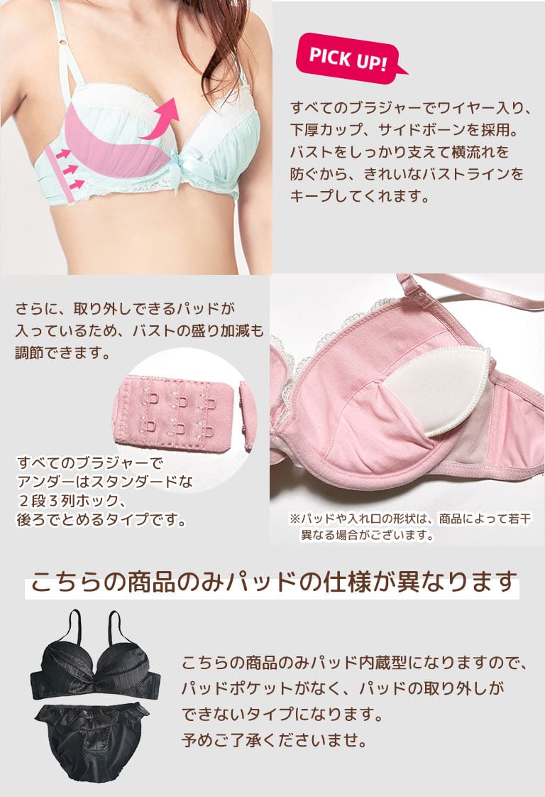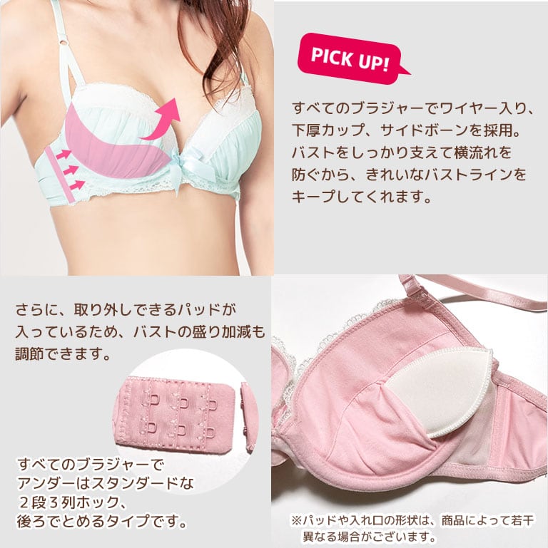 ●すべてのブラジャーでワイヤー入り、下厚カップ、サイドボーンを採用。