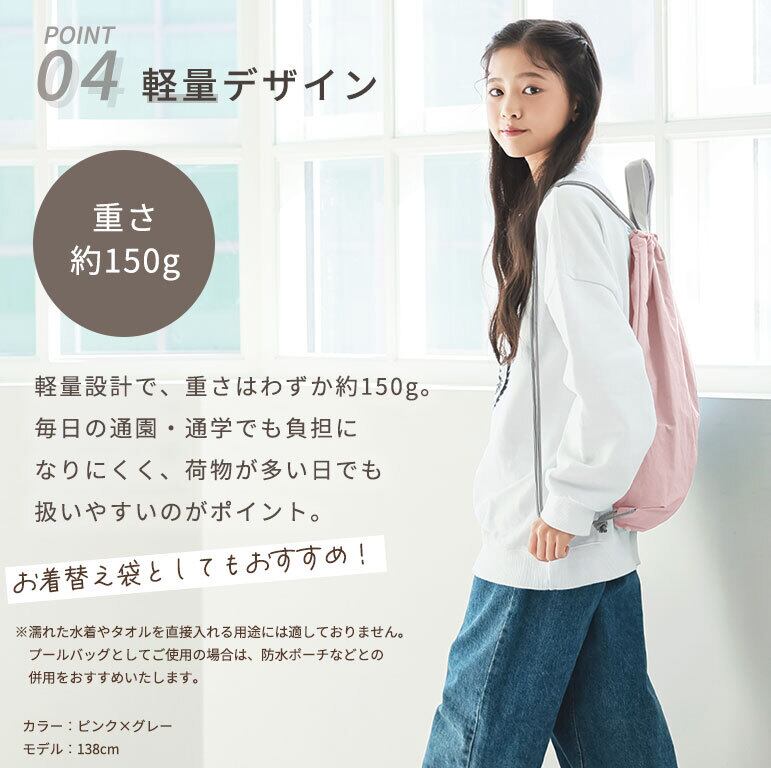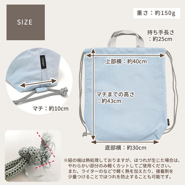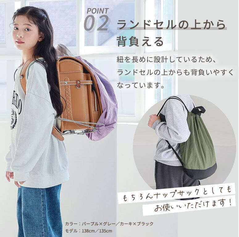 ●紐を長めにしてあるので、ランドセルの上からも背負いやすい♪もちろん、普通にナップサックとしてもお使いいただけます。