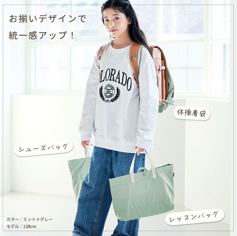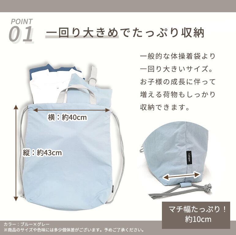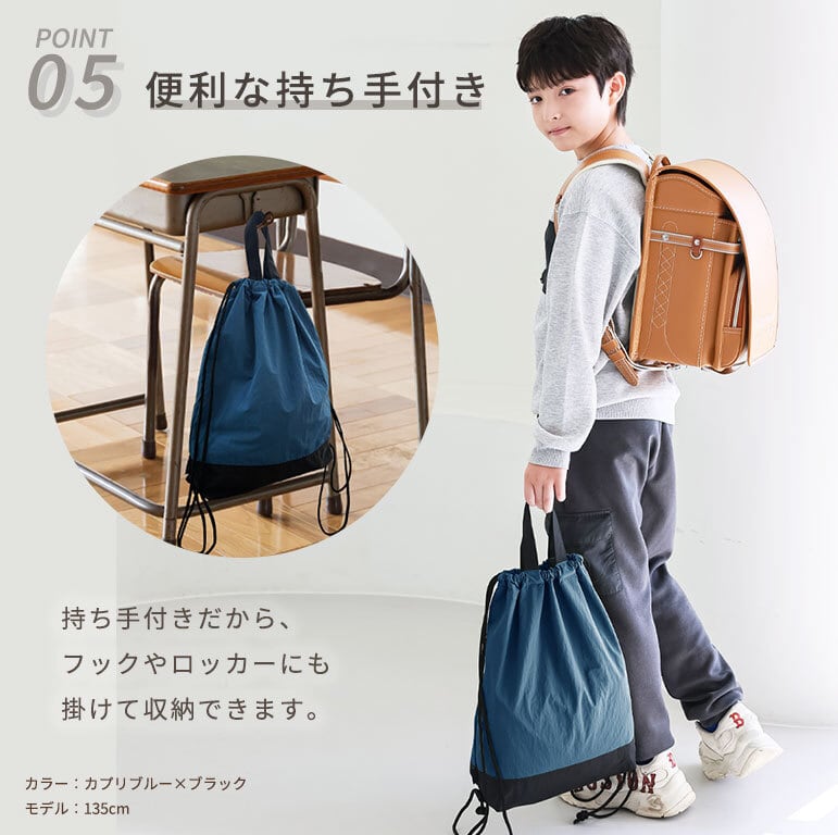 ●一般的な体操着入れより一回り大きいサイズ感。お子様の成長に伴って多くなる荷物をしっかり収納できます。